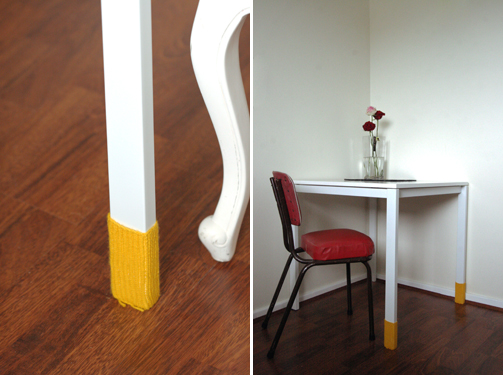 This is a recent little project that I'm half way through. I've been wanting to do it for ages and I finally did it! I knitted socks for my table! hehe. I've seen the dip painted tables (and other things) and love the look. But I also love knitting and have been wanting to incorporate it more into the house. Very simple but cute and adds a splash of colour to the table. The kitchen/dining colour theme is yellow (and leads to the lounge with splashes of red)